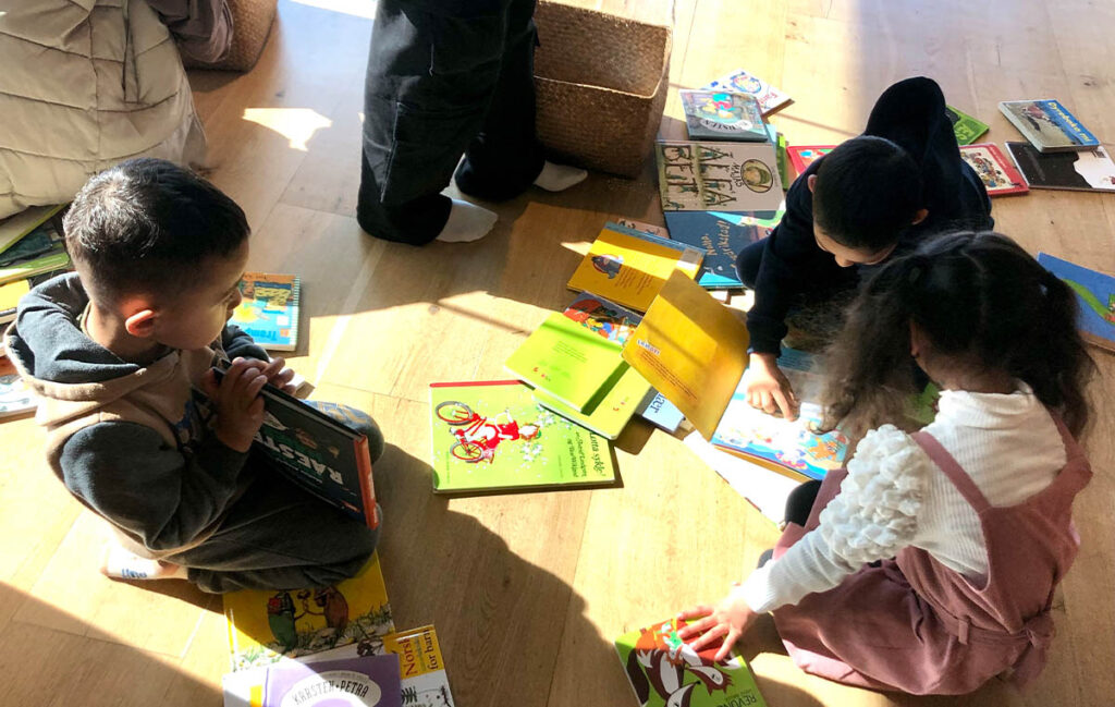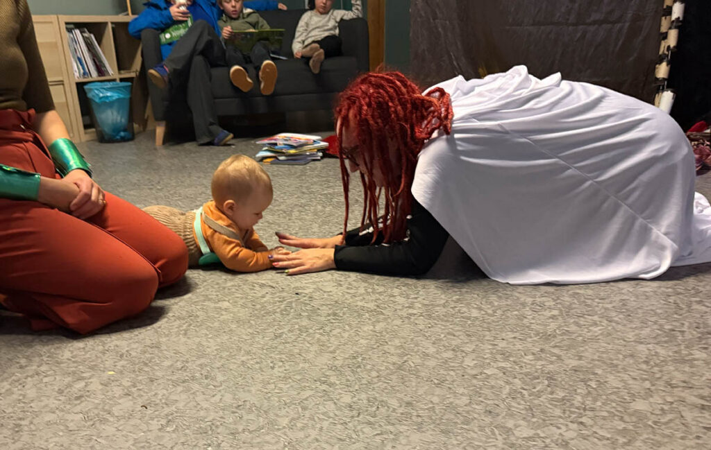Her leser vi morsomme bøker for og sammen med barna, vi danser, leker – og er i bevegelse.